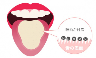 舌の表面の凸凹に食べかすや剝がれた粘膜が沢山含まれていて、お口の臭い原因となります。